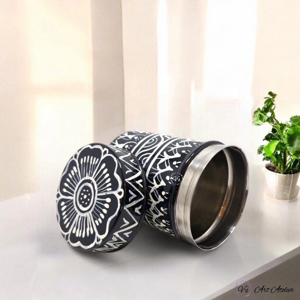 - A set of 3 hand-painted pattachitra steel jars with intricate designs, perfect for storage and adding a cultural touch to your daily life.