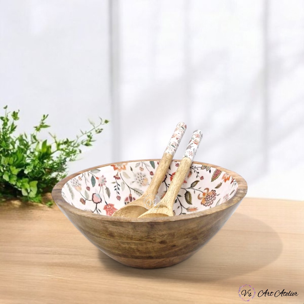 - Elevate your dining experience with this 10 inches printed mangowood bowl, accompanied by a matching spoon and fork server set.