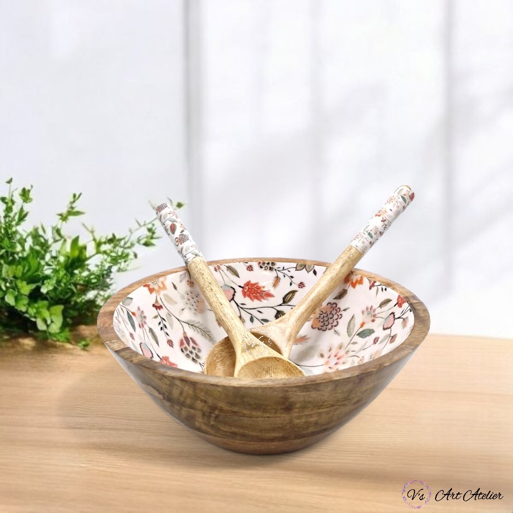 Printed mangowood bowl, paired with wooden spoon and fork, featuring vibrant designs and natural wood textures, perfect for serving, gifting, and creating a stylish dining experience. Comes as a set of one 10 inches bowl with a wooden spoon and fork server set. Ideal for serving dry snacks and fruits.