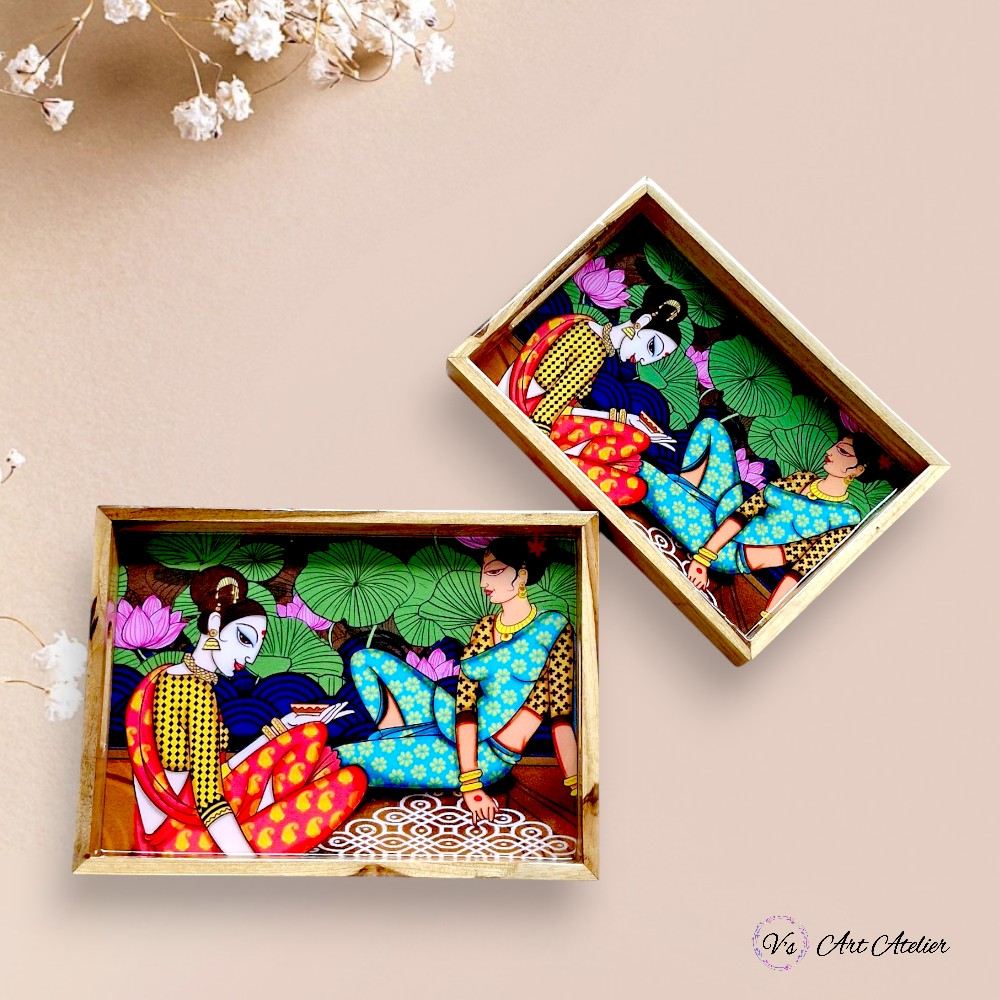 Indian Women Teakwood Printed Tray – Set of 2