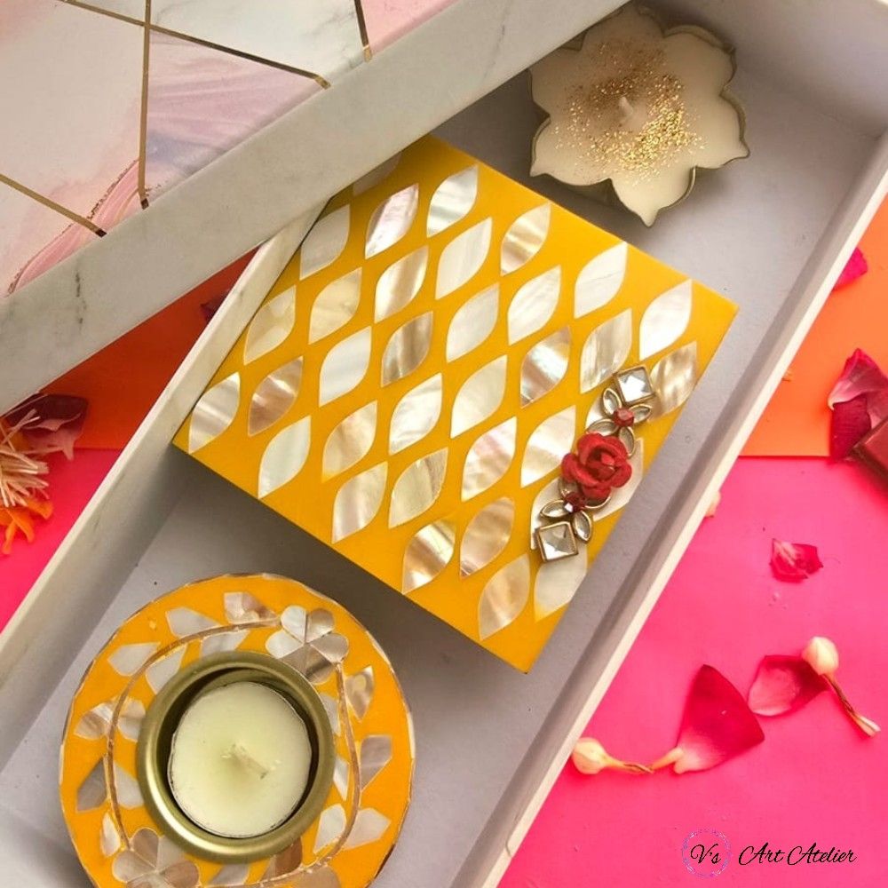 Elegant Mother of Pearl chowki with metal votive candle and tealight holder, it perfect for enhancing home décor, festive setups, or ceremonial displays. Ideal as a premium gift, this set adds a touch of sophistication and charm to any special occasion.