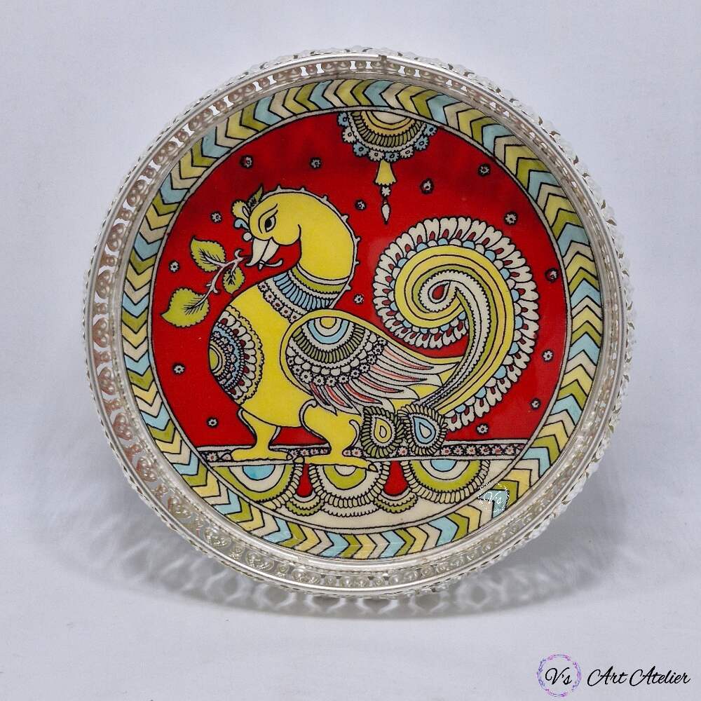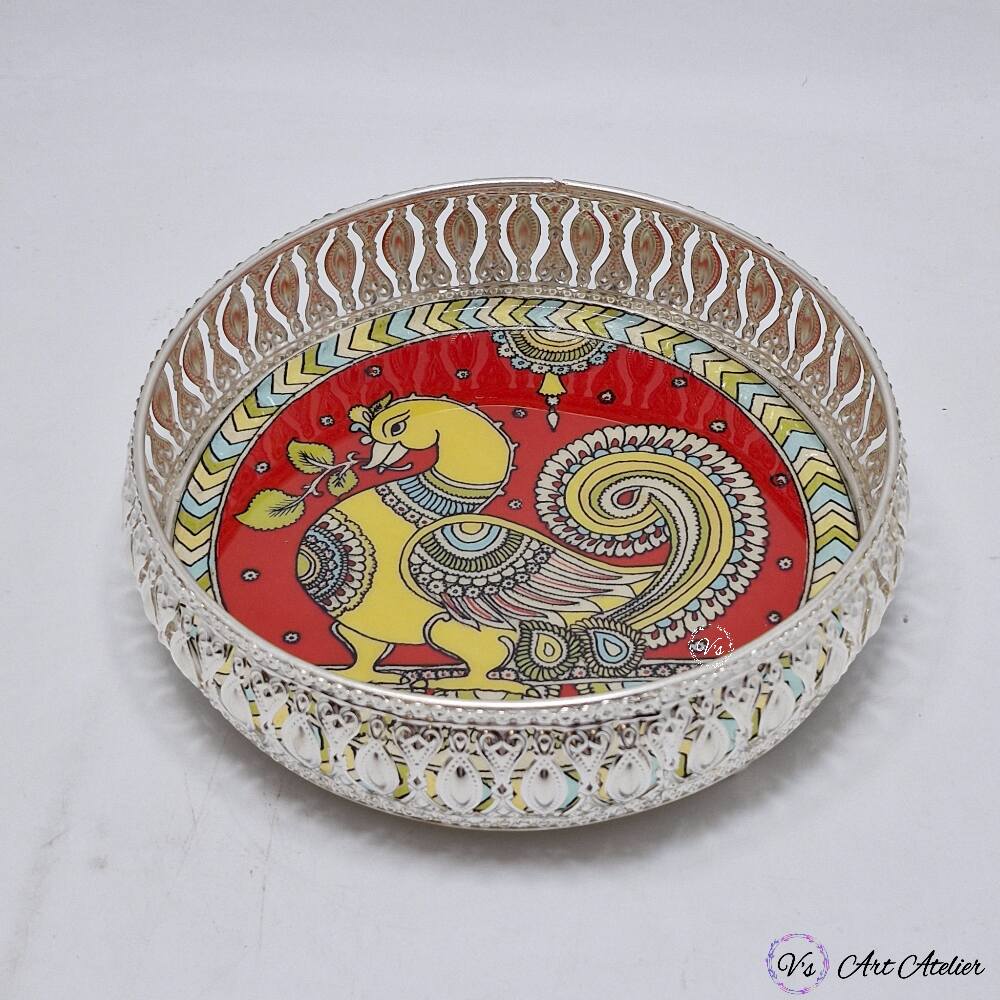 A striking German Silver Basket featuring a vibrant folk-art inspired peacock motif. Designed as both a functional utility piece and a statement décor accent, it works beautifully in spiritual spaces, living rooms, and festive settings.
