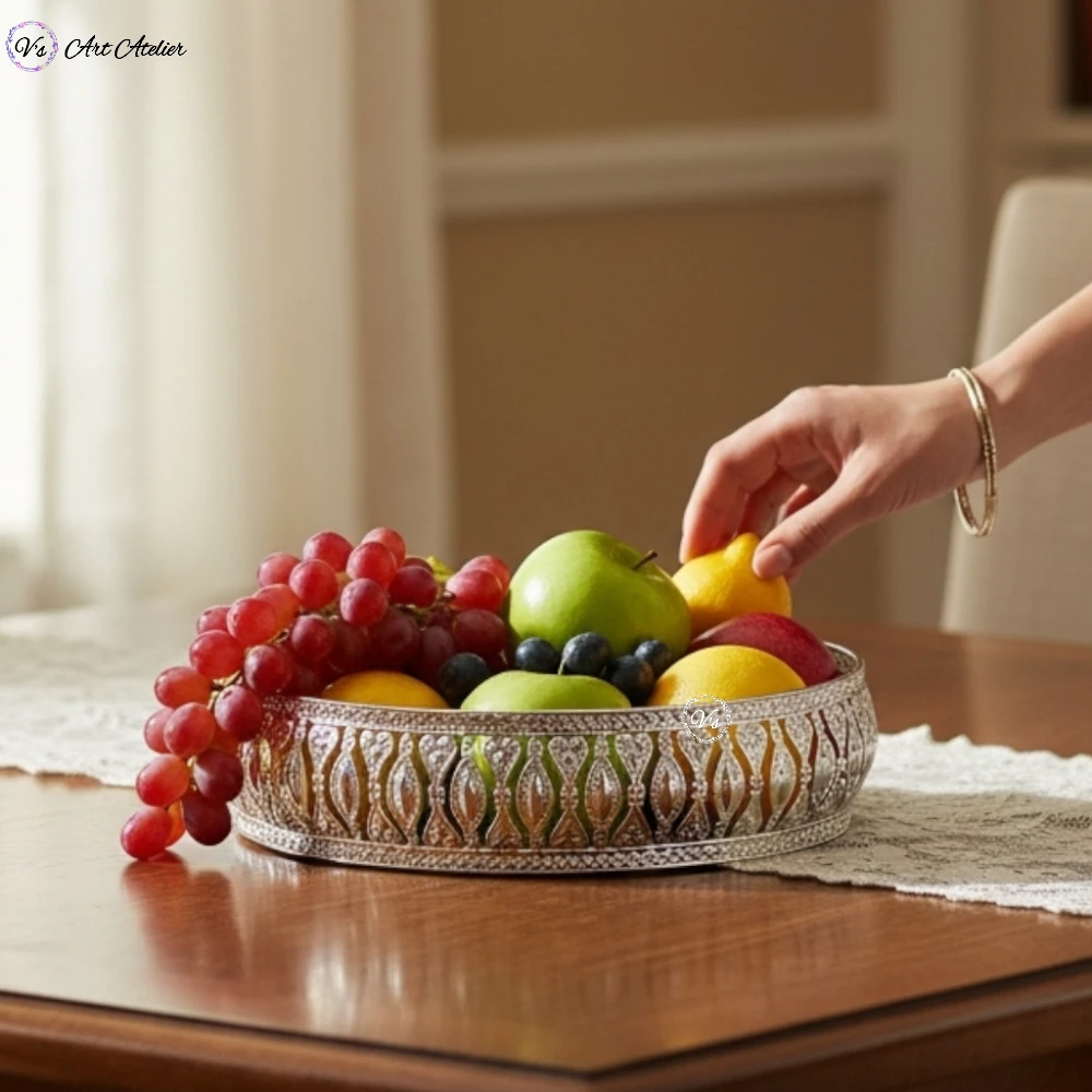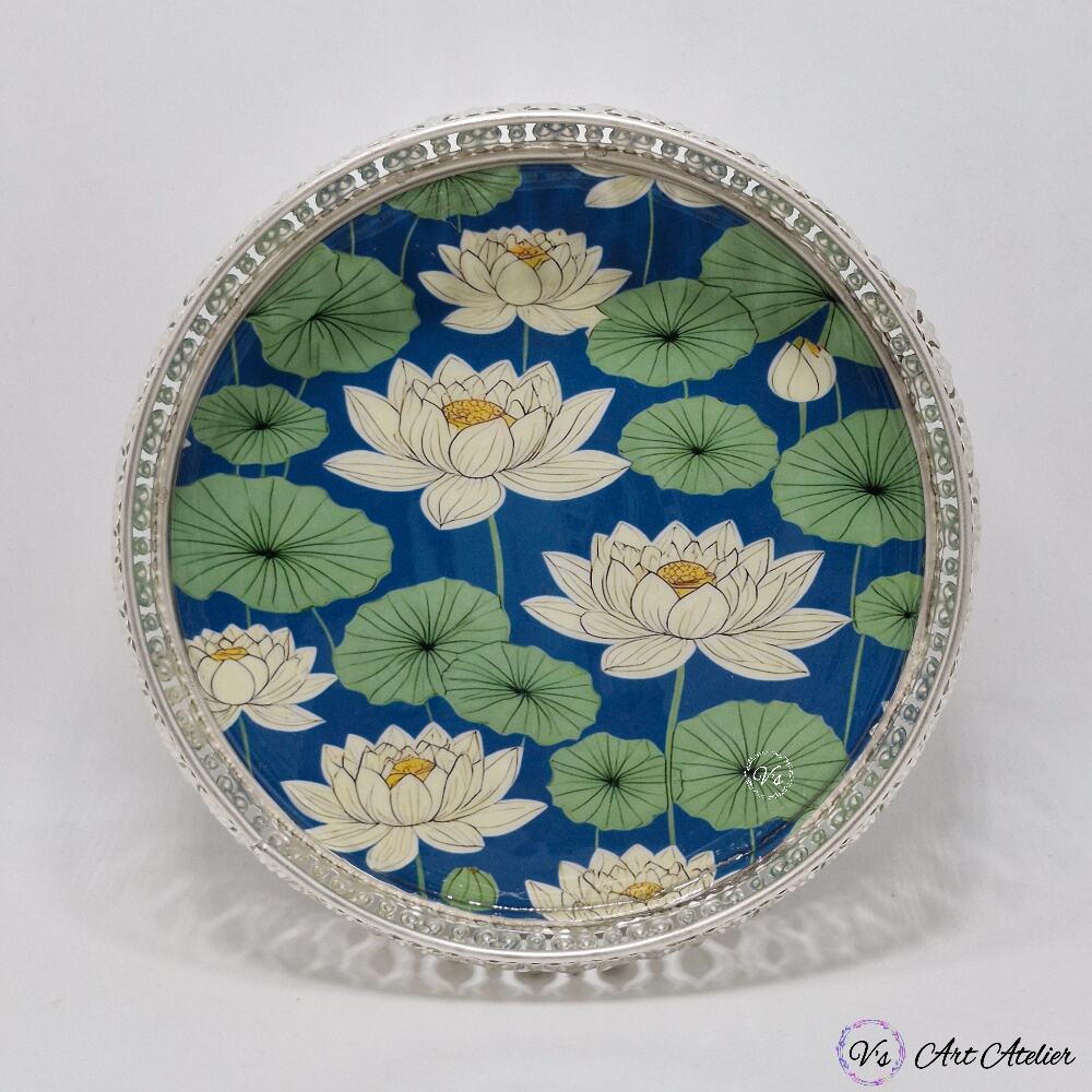 A Premium German Silver Basket featuring a serene white lotus design — perfect as a decorative accent for homes and spiritual spaces. Use it as a stylish utility tray or a thoughtful gifting piece for special occasions.